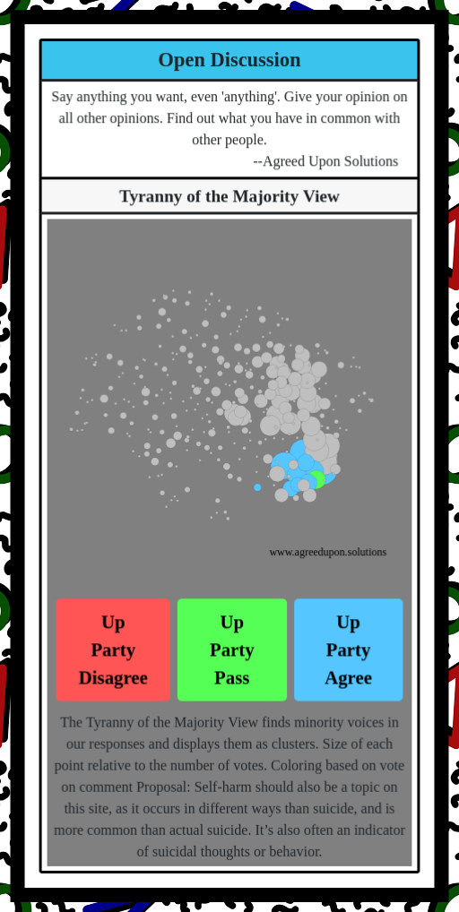 The Tyranny of the Majority View finds minority voices in our responses and displays them as clusters. Size of each point relative to the number of votes. Coloring based on vote on comment