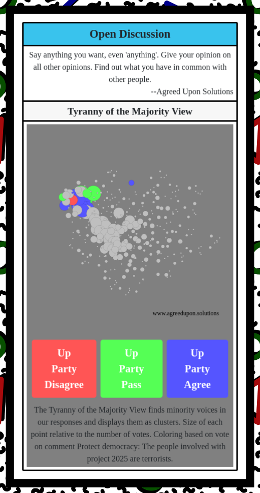 The Tyranny of the Majority View finds minority voices in our responses and displays them as clusters. Size of each point relative to the number of votes. Coloring based on vote on comment