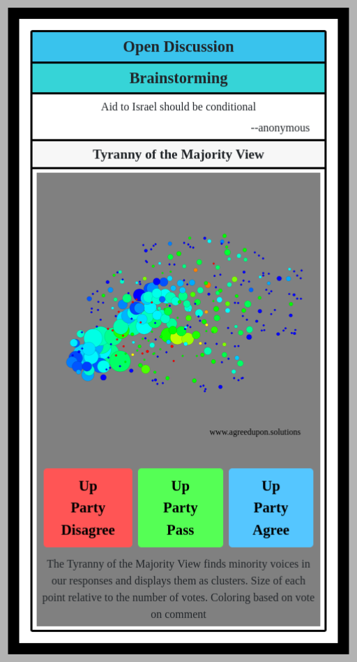 The Tyranny of the Majority View finds minority voices in our responses and displays them as clusters. Size of each point relative to the number of votes. Coloring based on vote on comment