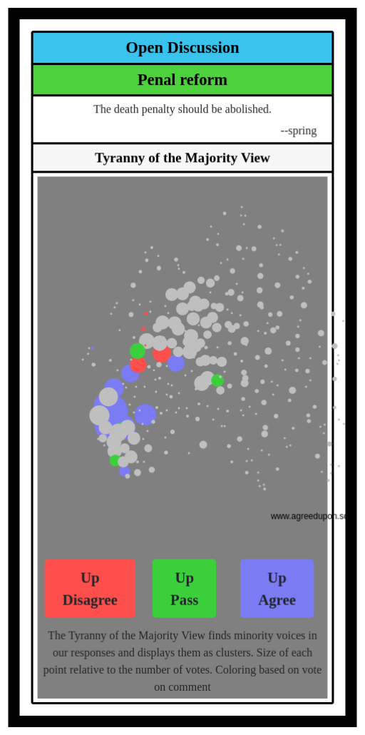 The Tyranny of the Majority View finds minority voices in our responses and displays them as clusters. Size of each point relative to the number of votes. Coloring based on vote on comment