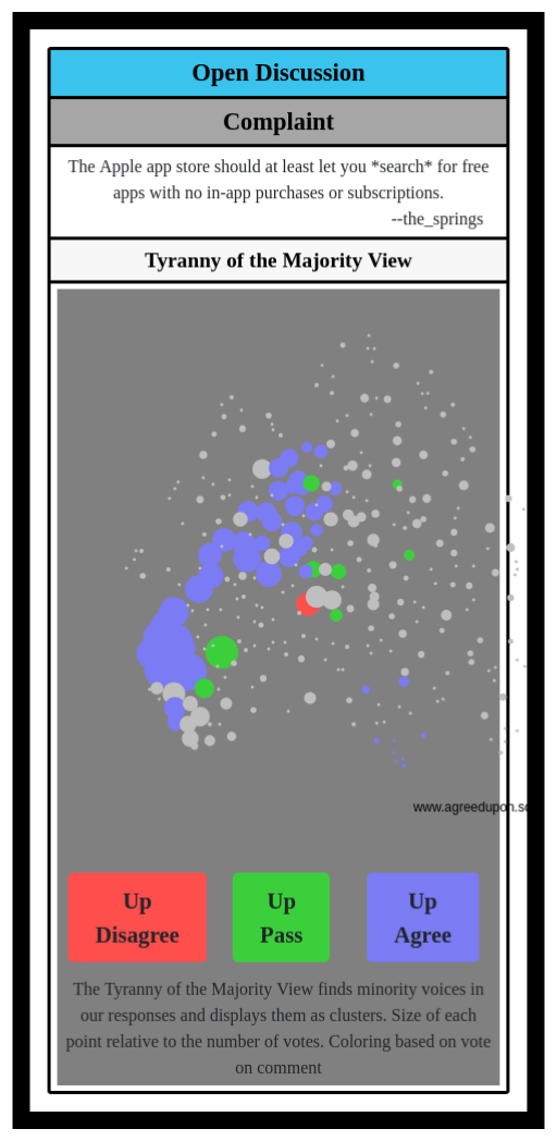 The Tyranny of the Majority View finds minority voices in our responses and displays them as clusters. Size of each point relative to the number of votes. Coloring based on vote on comment