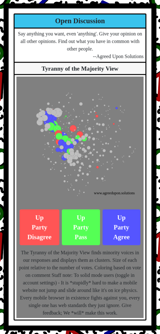 The Tyranny of the Majority View finds minority voices in our responses and displays them as clusters. Size of each point relative to the number of votes. Coloring based on vote on comment