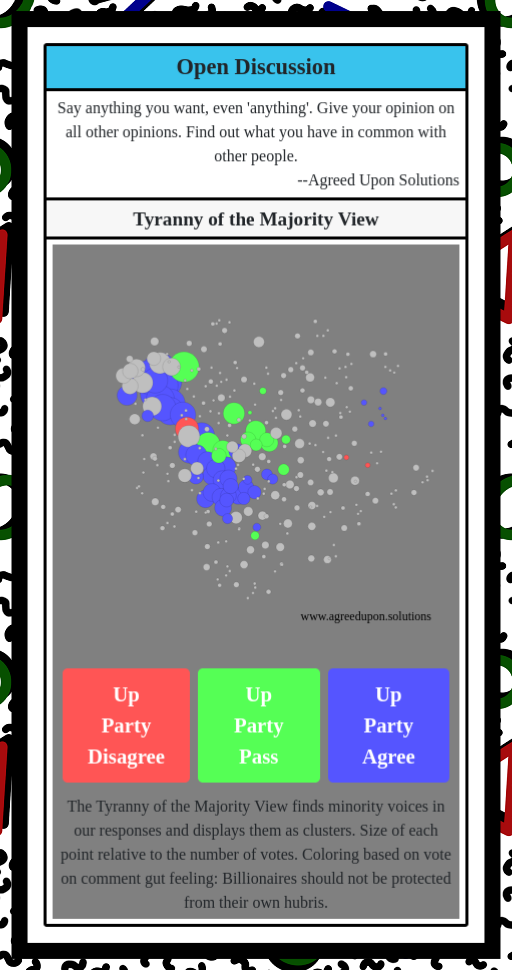 The Tyranny of the Majority View finds minority voices in our responses and displays them as clusters. Size of each point relative to the number of votes. Coloring based on vote on comment