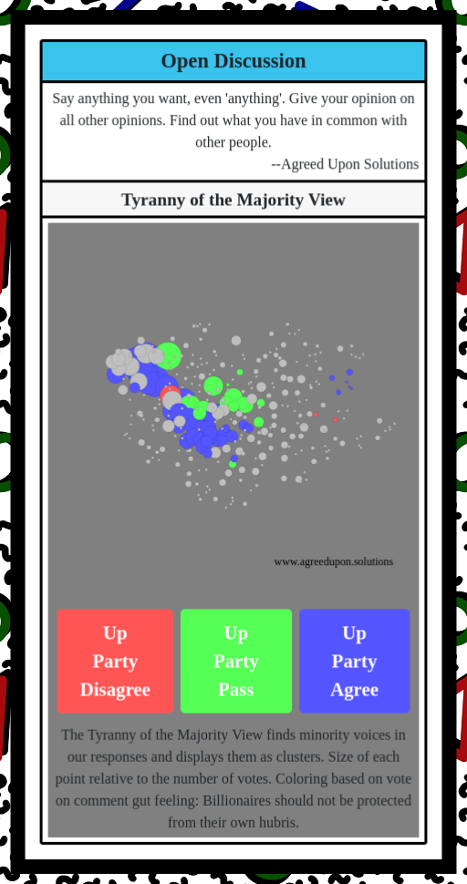 The Tyranny of the Majority View finds minority voices in our responses and displays them as clusters. Size of each point relative to the number of votes. Coloring based on vote on comment