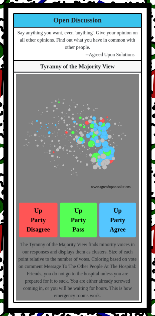 The Tyranny of the Majority View finds minority voices in our responses and displays them as clusters. Size of each point relative to the number of votes. Coloring based on vote on comment
