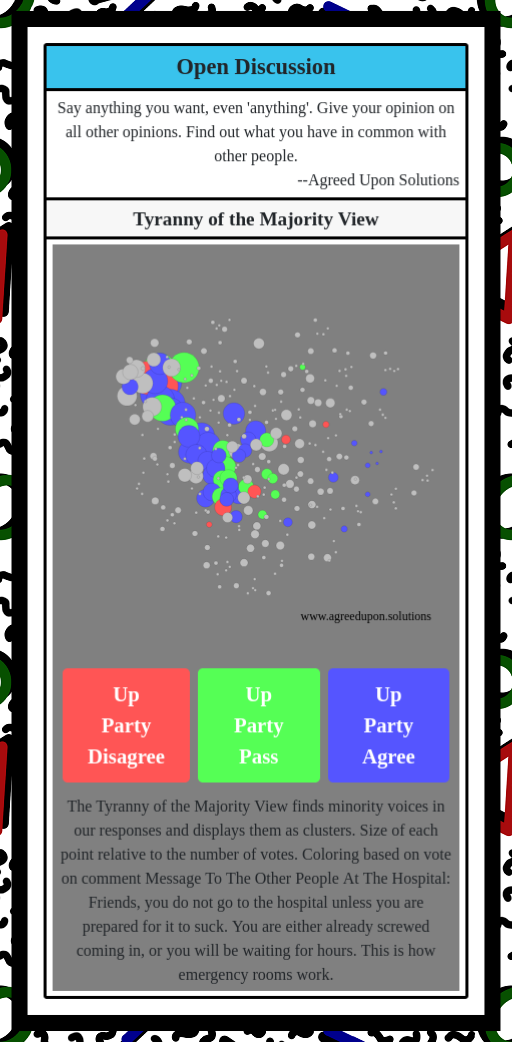 The Tyranny of the Majority View finds minority voices in our responses and displays them as clusters. Size of each point relative to the number of votes. Coloring based on vote on comment