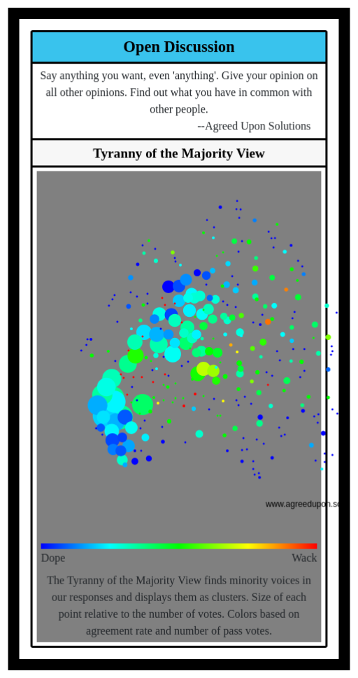 The Tyranny of the Majority View finds minority voices in our responses and displays them as clusters. Size of each point relative to the number of votes. Colors based on agreement rate and number of pass votes.