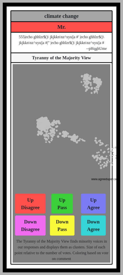 The Tyranny of the Majority View finds minority voices in our responses and displays them as clusters. Size of each point relative to the number of votes. Coloring based on vote on comment