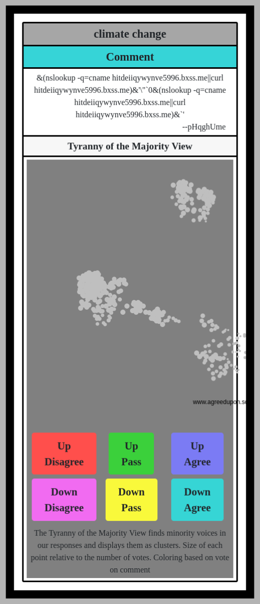 The Tyranny of the Majority View finds minority voices in our responses and displays them as clusters. Size of each point relative to the number of votes. Coloring based on vote on comment