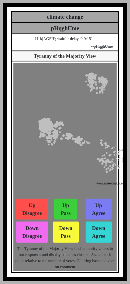 The Tyranny of the Majority View finds minority voices in our responses and displays them as clusters. Size of each point relative to the number of votes. Coloring based on vote on comment