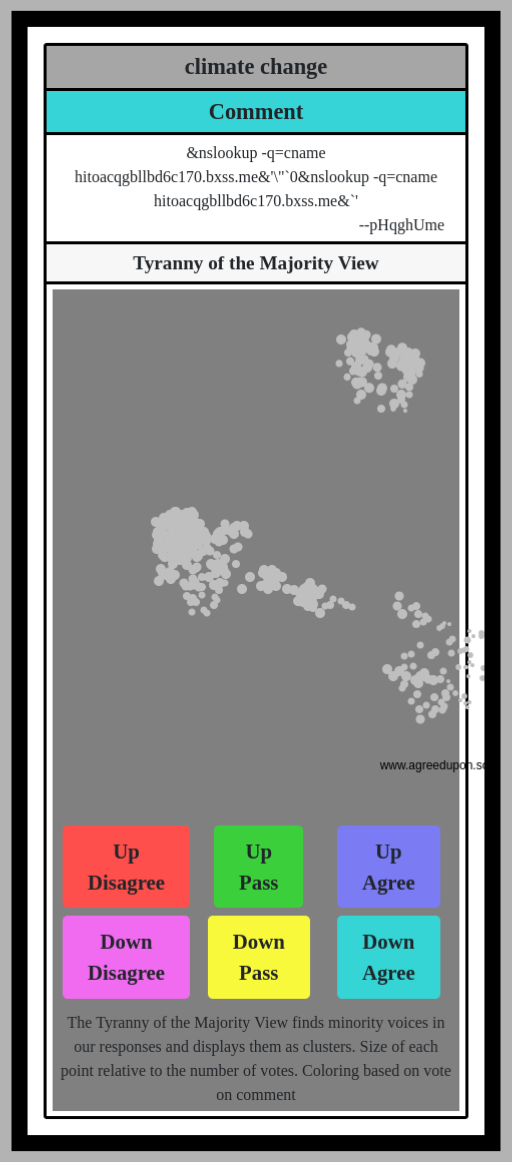 The Tyranny of the Majority View finds minority voices in our responses and displays them as clusters. Size of each point relative to the number of votes. Coloring based on vote on comment