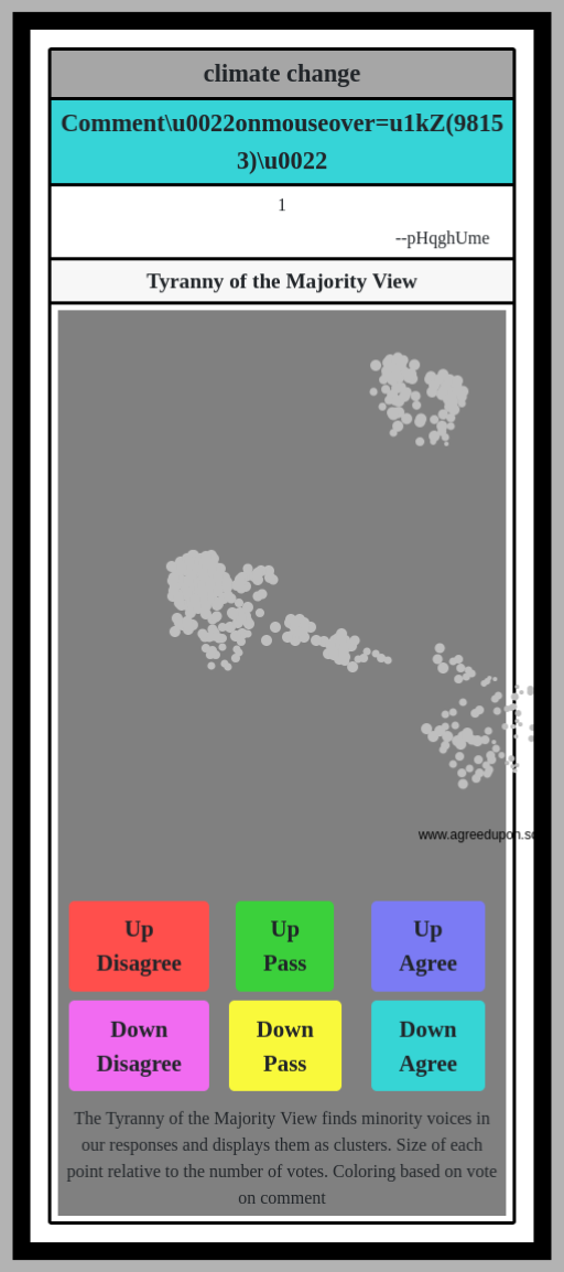 The Tyranny of the Majority View finds minority voices in our responses and displays them as clusters. Size of each point relative to the number of votes. Coloring based on vote on comment