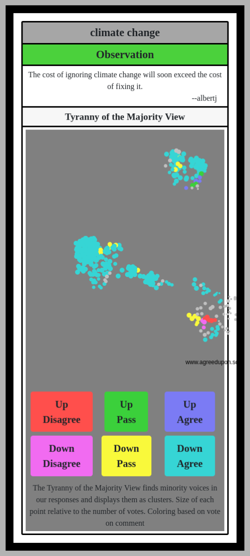 The Tyranny of the Majority View finds minority voices in our responses and displays them as clusters. Size of each point relative to the number of votes. Coloring based on vote on comment