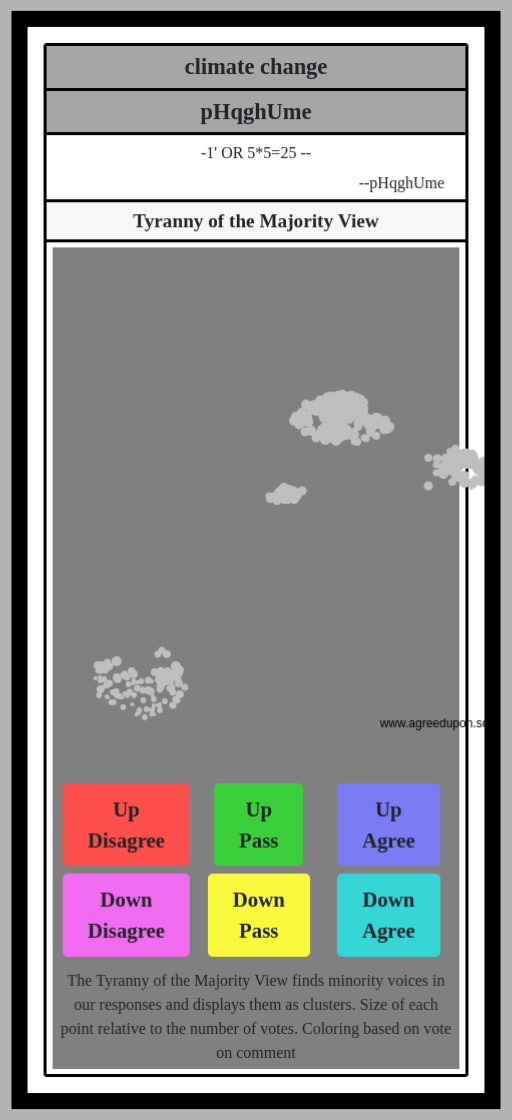 The Tyranny of the Majority View finds minority voices in our responses and displays them as clusters. Size of each point relative to the number of votes. Coloring based on vote on comment
