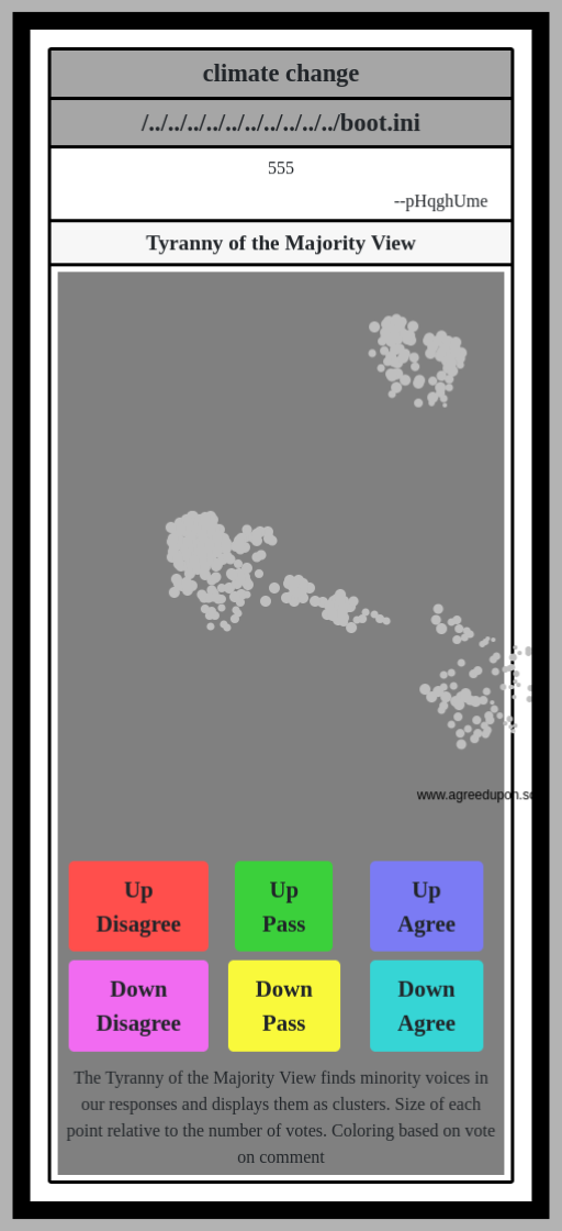 The Tyranny of the Majority View finds minority voices in our responses and displays them as clusters. Size of each point relative to the number of votes. Coloring based on vote on comment