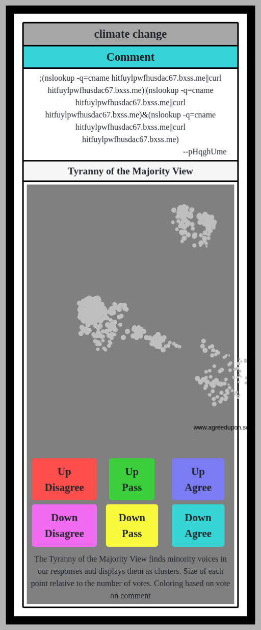 The Tyranny of the Majority View finds minority voices in our responses and displays them as clusters. Size of each point relative to the number of votes. Coloring based on vote on comment