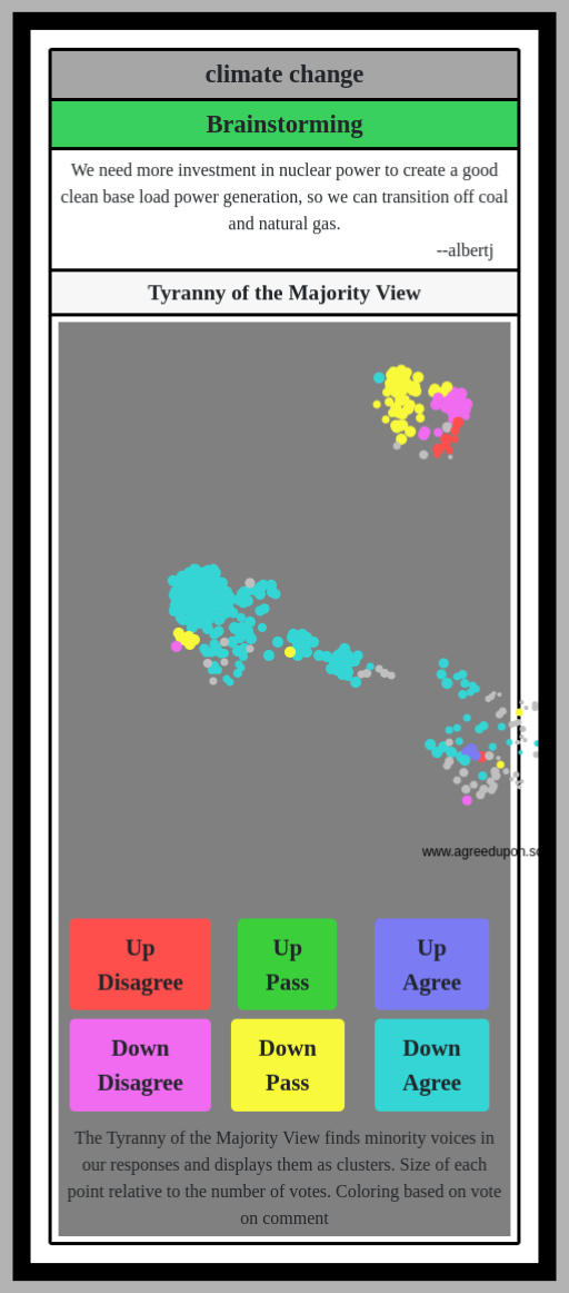 The Tyranny of the Majority View finds minority voices in our responses and displays them as clusters. Size of each point relative to the number of votes. Coloring based on vote on comment