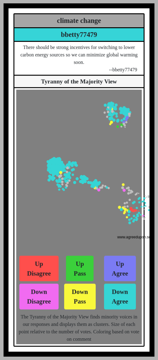 The Tyranny of the Majority View finds minority voices in our responses and displays them as clusters. Size of each point relative to the number of votes. Coloring based on vote on comment