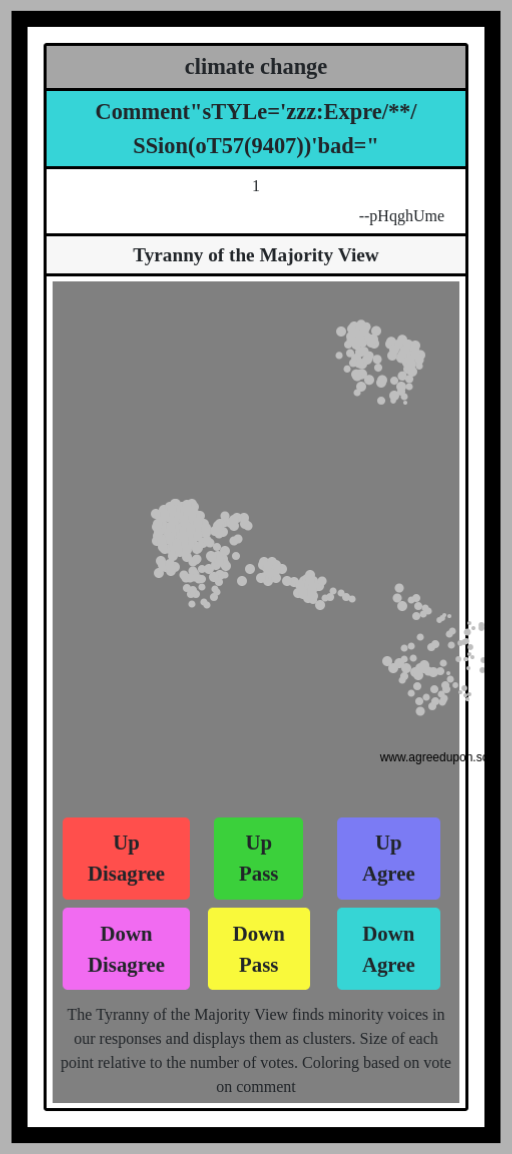 The Tyranny of the Majority View finds minority voices in our responses and displays them as clusters. Size of each point relative to the number of votes. Coloring based on vote on comment