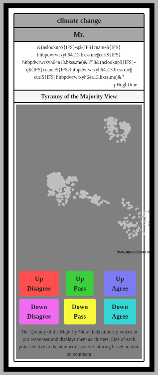 The Tyranny of the Majority View finds minority voices in our responses and displays them as clusters. Size of each point relative to the number of votes. Coloring based on vote on comment