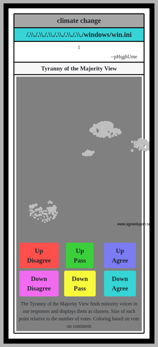 The Tyranny of the Majority View finds minority voices in our responses and displays them as clusters. Size of each point relative to the number of votes. Coloring based on vote on comment