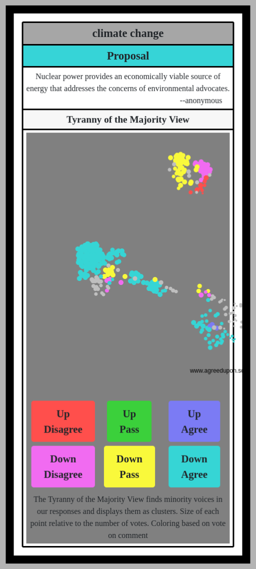 The Tyranny of the Majority View finds minority voices in our responses and displays them as clusters. Size of each point relative to the number of votes. Coloring based on vote on comment