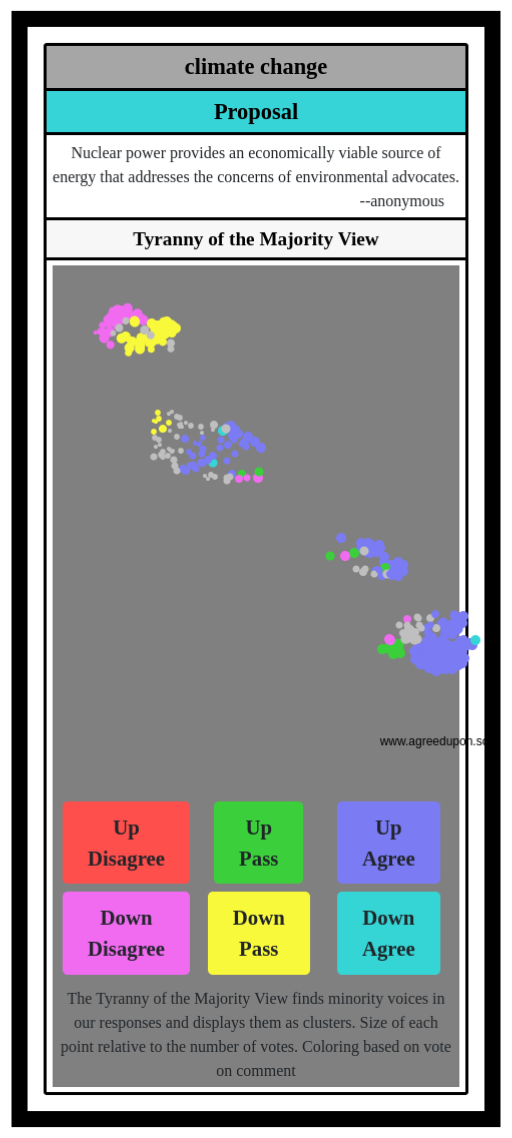 The Tyranny of the Majority View finds minority voices in our responses and displays them as clusters. Size of each point relative to the number of votes. Coloring based on vote on comment