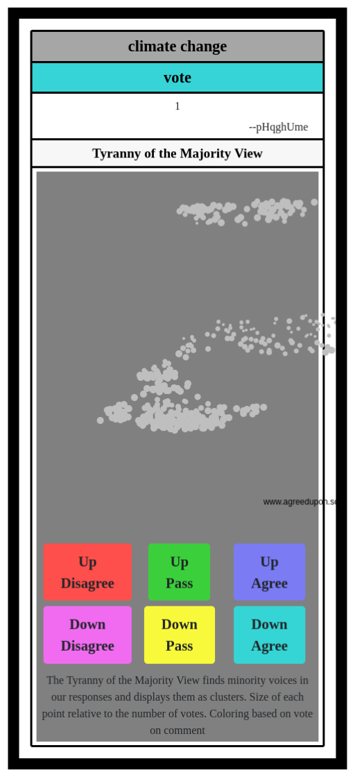 The Tyranny of the Majority View finds minority voices in our responses and displays them as clusters. Size of each point relative to the number of votes. Coloring based on vote on comment