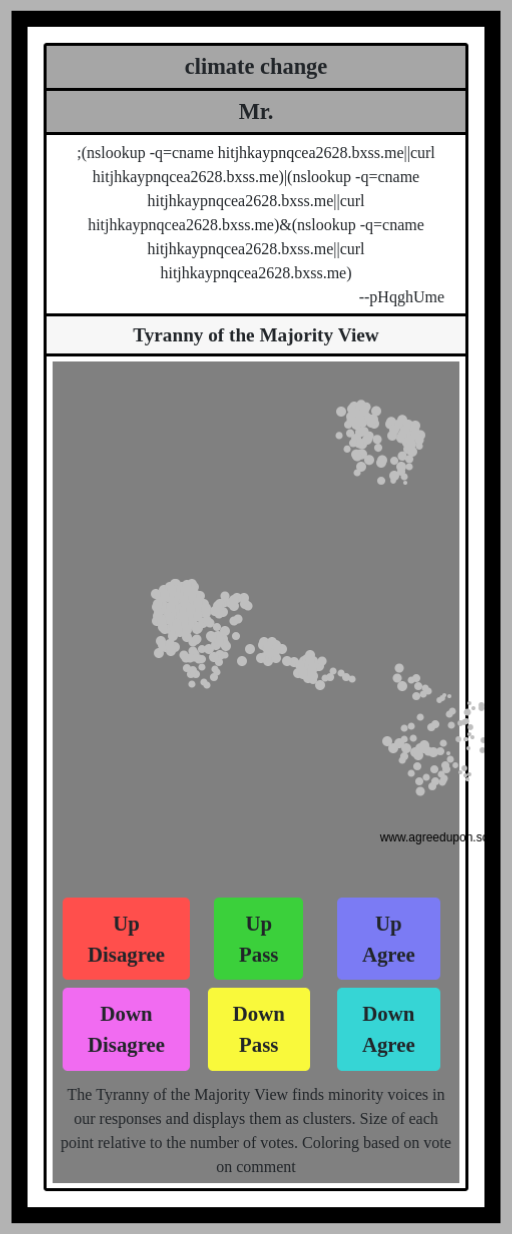 The Tyranny of the Majority View finds minority voices in our responses and displays them as clusters. Size of each point relative to the number of votes. Coloring based on vote on comment