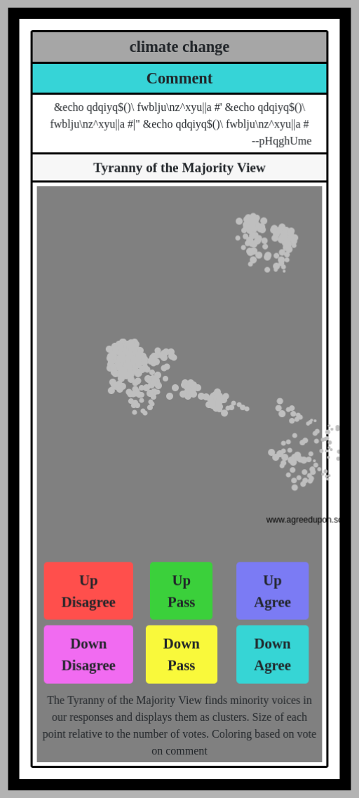 The Tyranny of the Majority View finds minority voices in our responses and displays them as clusters. Size of each point relative to the number of votes. Coloring based on vote on comment