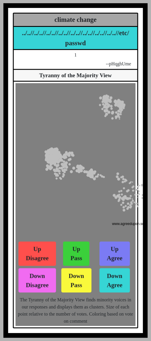 The Tyranny of the Majority View finds minority voices in our responses and displays them as clusters. Size of each point relative to the number of votes. Coloring based on vote on comment