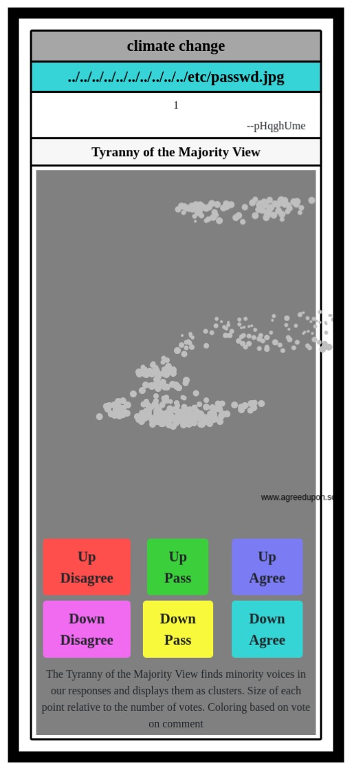 The Tyranny of the Majority View finds minority voices in our responses and displays them as clusters. Size of each point relative to the number of votes. Coloring based on vote on comment