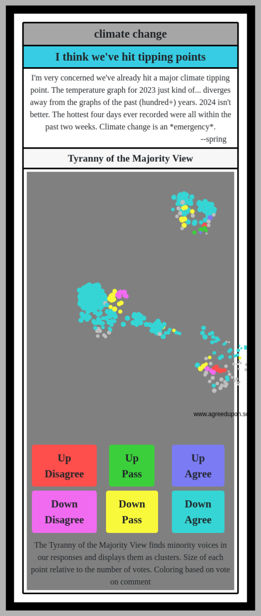 The Tyranny of the Majority View finds minority voices in our responses and displays them as clusters. Size of each point relative to the number of votes. Coloring based on vote on comment