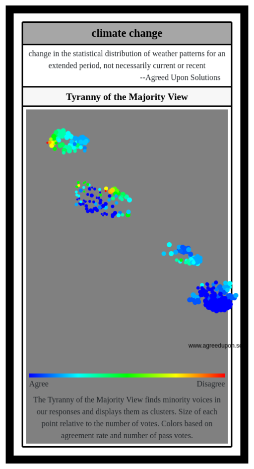 The Tyranny of the Majority View finds minority voices in our responses and displays them as clusters. Size of each point relative to the number of votes. Colors based on agreement rate and number of pass votes.