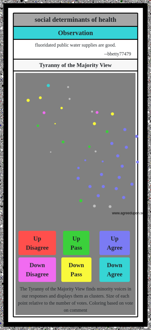 The Tyranny of the Majority View finds minority voices in our responses and displays them as clusters. Size of each point relative to the number of votes. Coloring based on vote on comment