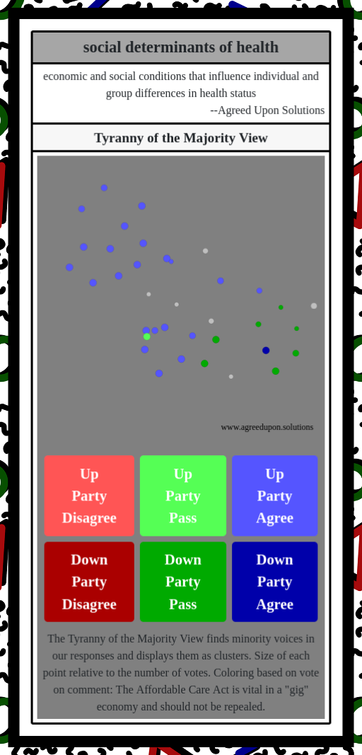 The Tyranny of the Majority View finds minority voices in our responses and displays them as clusters. Size of each point relative to the number of votes. Coloring based on vote on comment