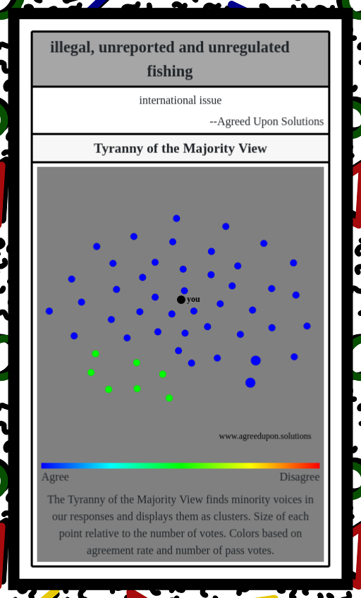 The Tyranny of the Majority View finds minority voices in our responses and displays them as clusters. Size of each point relative to the number of votes. Colors based on agreement rate and number of pass votes.