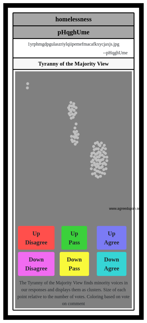 The Tyranny of the Majority View finds minority voices in our responses and displays them as clusters. Size of each point relative to the number of votes. Colors based on agreement rate and number of pass votes.