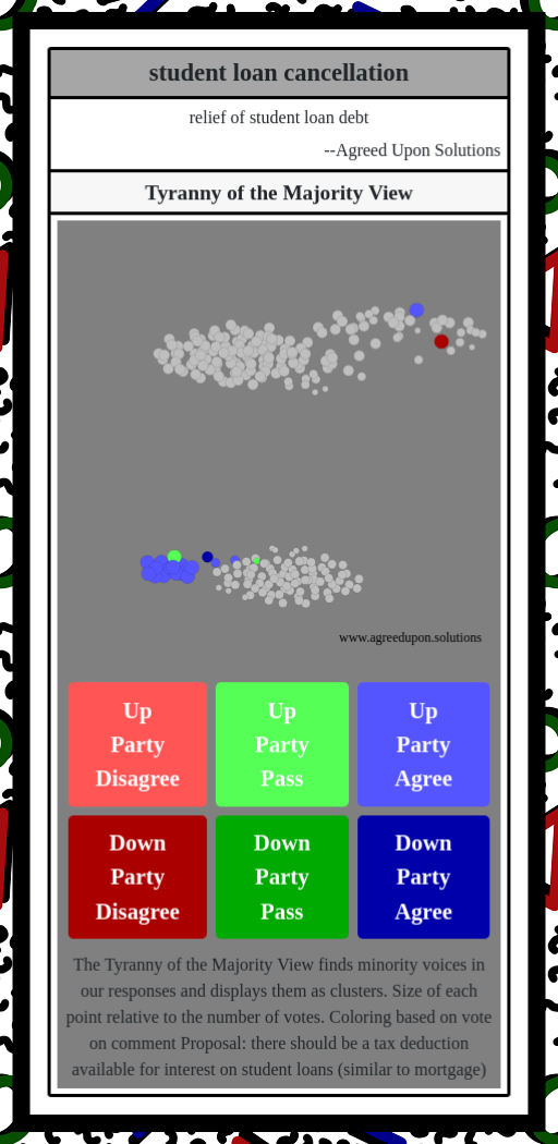 The Tyranny of the Majority View finds minority voices in our responses and displays them as clusters. Size of each point relative to the number of votes. Coloring based on vote on comment