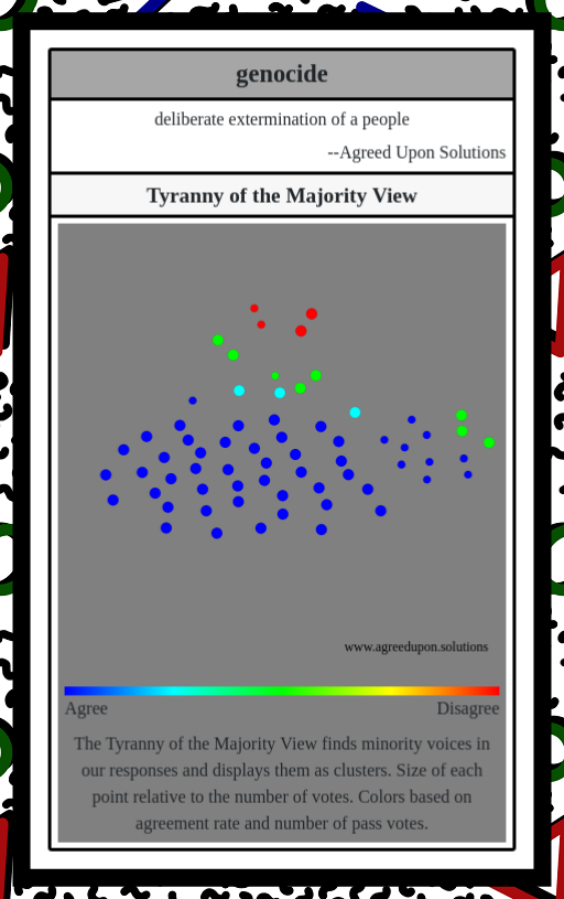 The Tyranny of the Majority View finds minority voices in our responses and displays them as clusters. Size of each point relative to the number of votes. Colors based on agreement rate and number of pass votes.