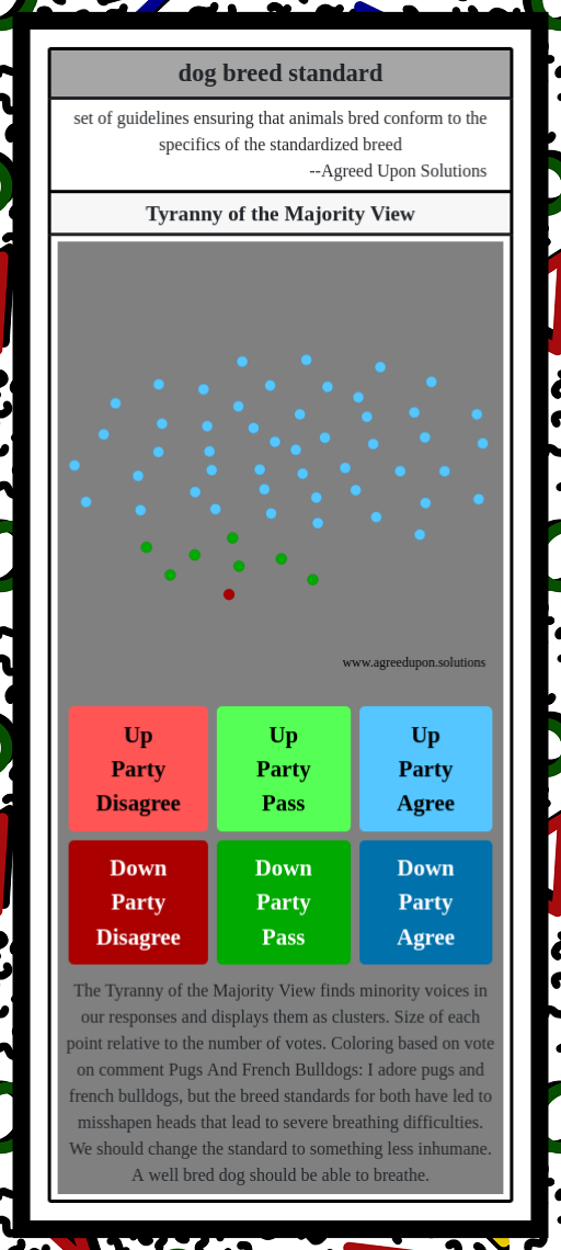 I adore pugs and french bulldogs, but the breed standards for both have led to misshapen heads that lead to severe breathing difficulties. We should change the standard to something less inhumane. A well bred dog should be able to breathe.