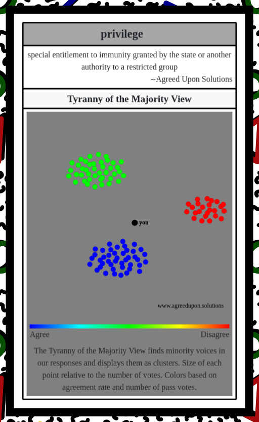 The Tyranny of the Majority View finds minority voices in our responses and displays them as clusters. Size of each point relative to the number of votes. Colors based on agreement rate and number of pass votes.