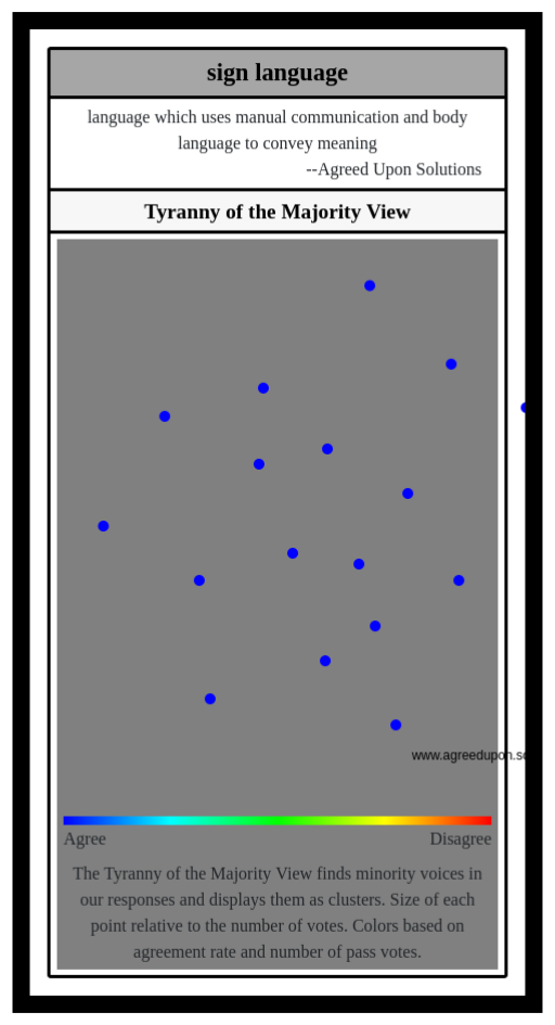 The Tyranny of the Majority View finds minority voices in our responses and displays them as clusters. Size of each point relative to the number of votes. Colors based on agreement rate and number of pass votes.