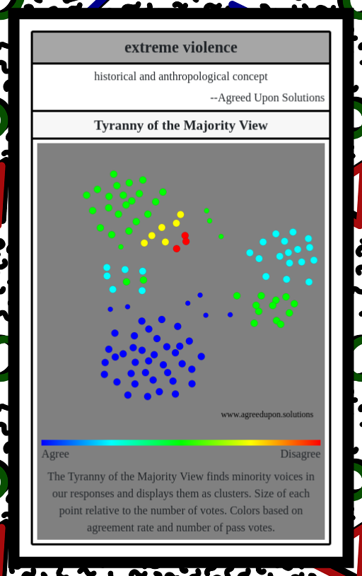 The Tyranny of the Majority View finds minority voices in our responses and displays them as clusters. Size of each point relative to the number of votes. Colors based on agreement rate and number of pass votes.