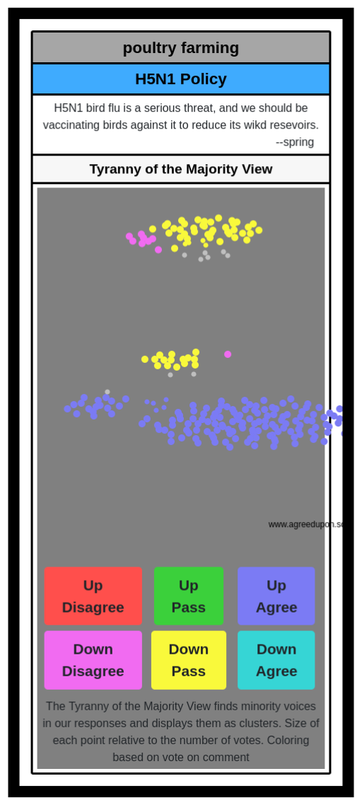 The Tyranny of the Majority View finds minority voices in our responses and displays them as clusters. Size of each point relative to the number of votes. Coloring based on vote on comment