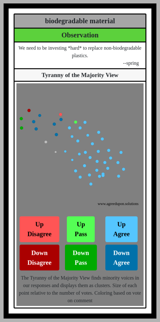 The Tyranny of the Majority View finds minority voices in our responses and displays them as clusters. Size of each point relative to the number of votes. Coloring based on vote on comment