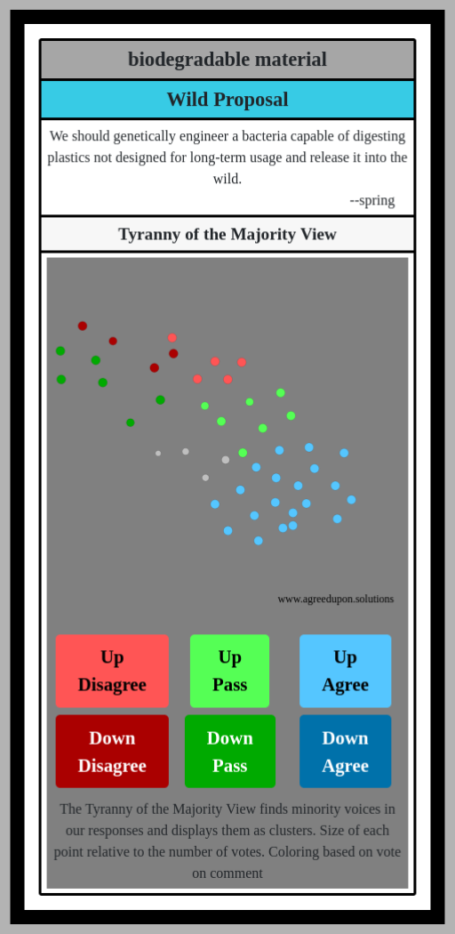 The Tyranny of the Majority View finds minority voices in our responses and displays them as clusters. Size of each point relative to the number of votes. Coloring based on vote on comment